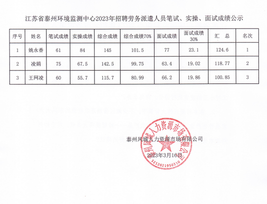 江蘇省泰州環境監測中心2023年公開招聘勞務派遣人員擬聘用人員公示