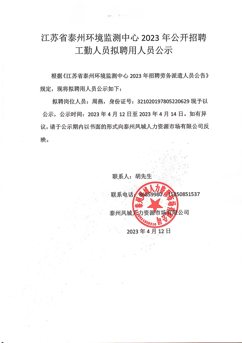 江蘇省泰州環境監測中心2023年公開招聘 工勤人員擬聘用人員公示