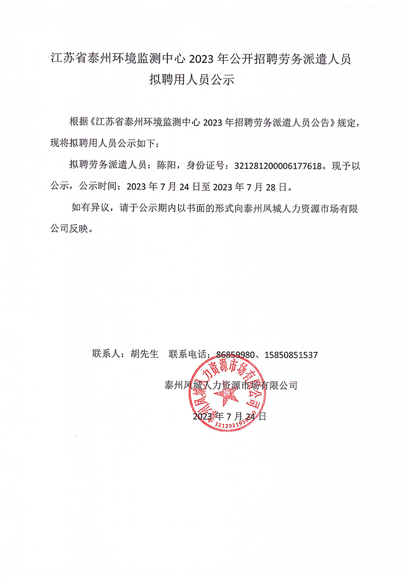 江蘇省泰州環境監測中心2023年公開招聘勞務派遣人員 擬聘用人員公示