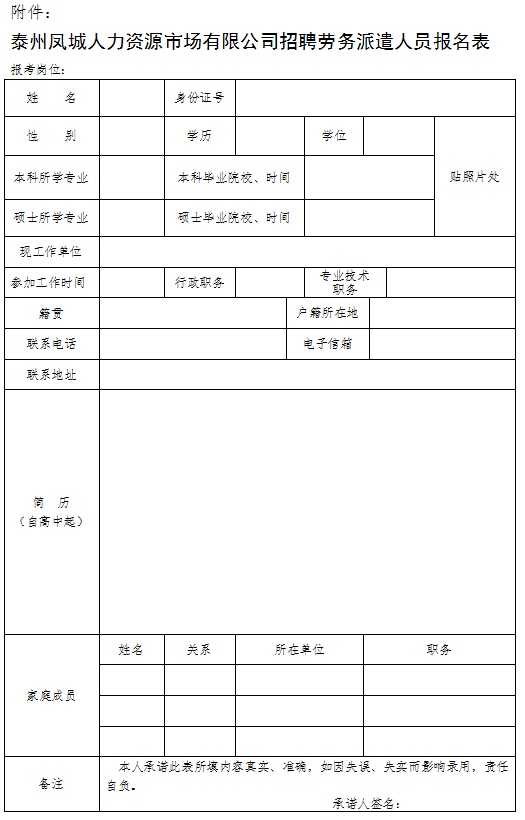 泰州鳳城人力資源市場有限公司招聘勞務派遣人員報名表 點此下載