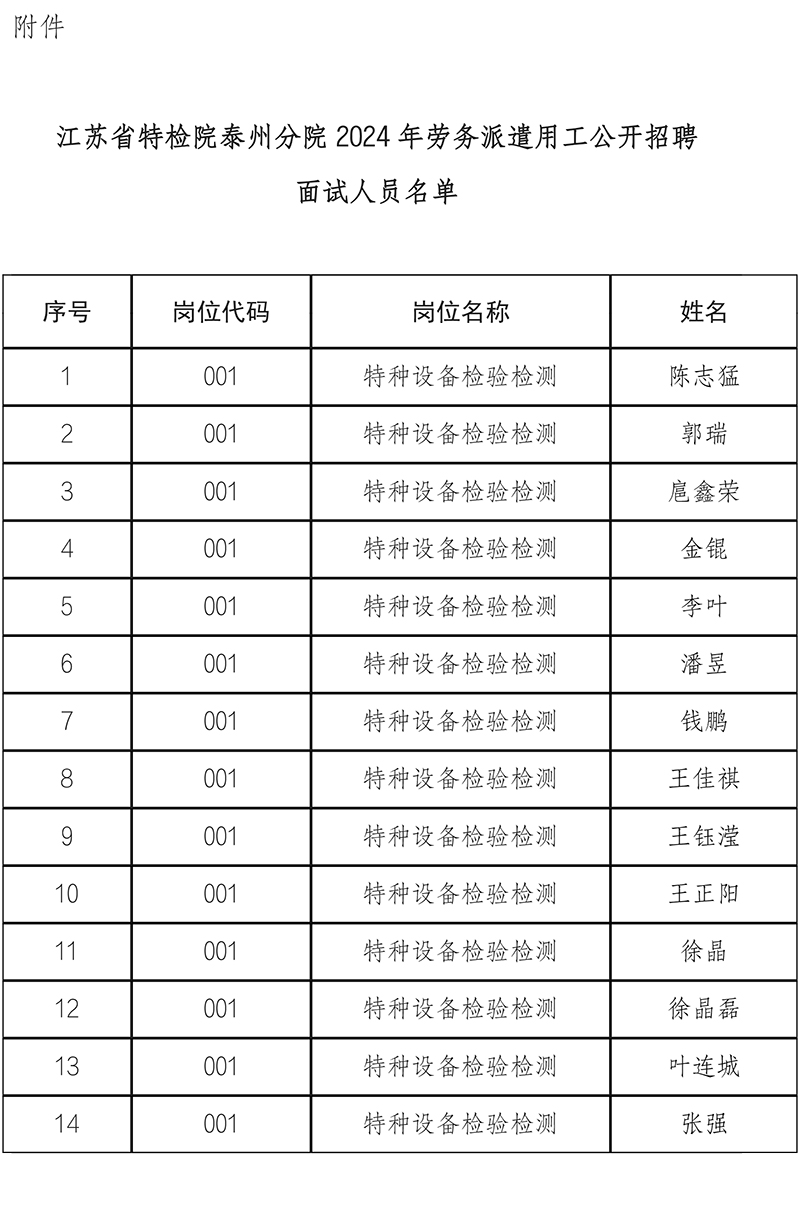 江蘇省特檢院泰州分院2024年勞務派遣用工人員公開招聘面試人員名單